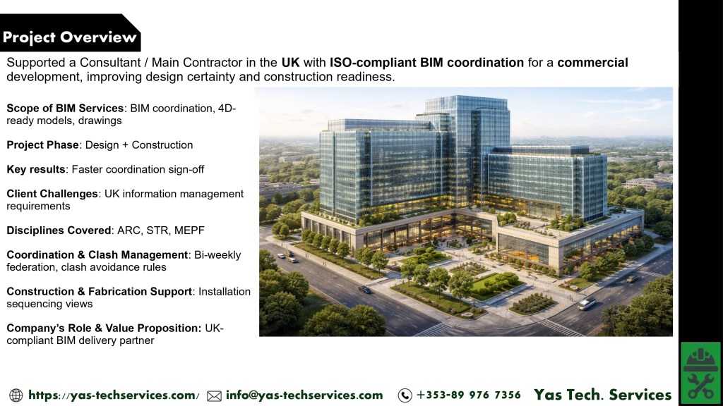 - Acted as a UK-compliant BIM delivery partner, ensuring adherence to ISO 19650 requirements.