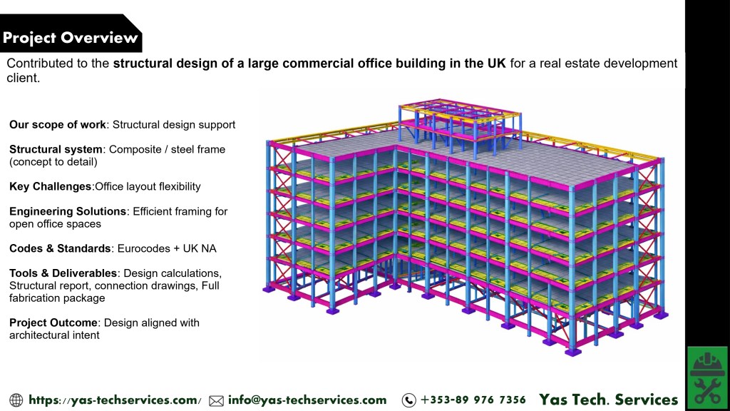 - Structural grids and member sizes were optimised to support architectural planning and future adaptability.